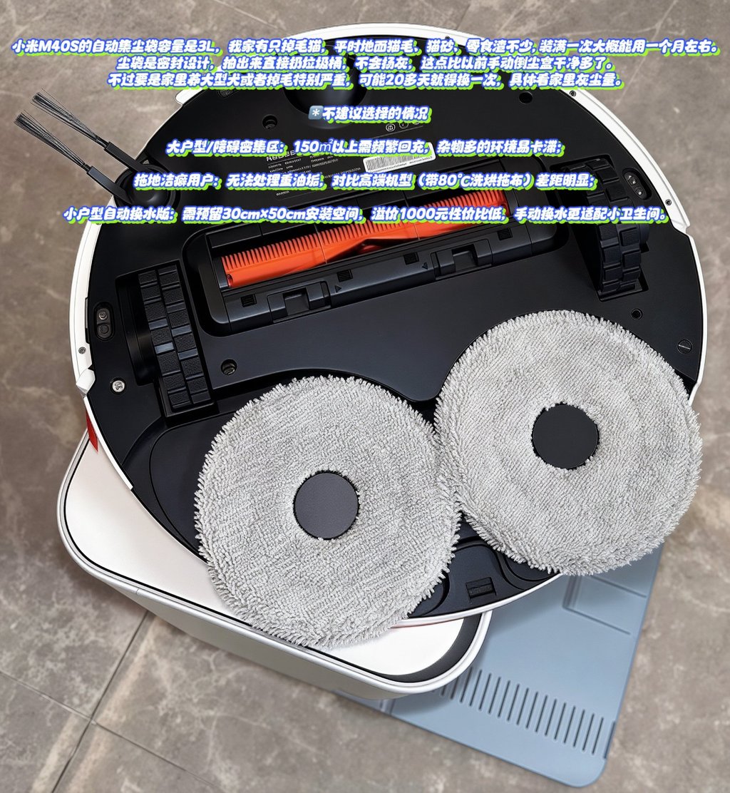 小米M40S更适合中小户型、养宠/有娃家庭及预算有限的懒人用户,其在吸力、毛发处理、基础自清洁方面的表现可满足日常需求。若追求“完全免维护”或大户型高效清洁,建议加预算选择带洗烘拖布、长续航的高端机型;若为90㎡以下小户型且无极致拖地需求,M40S可作为“一步到位”的务实之选。