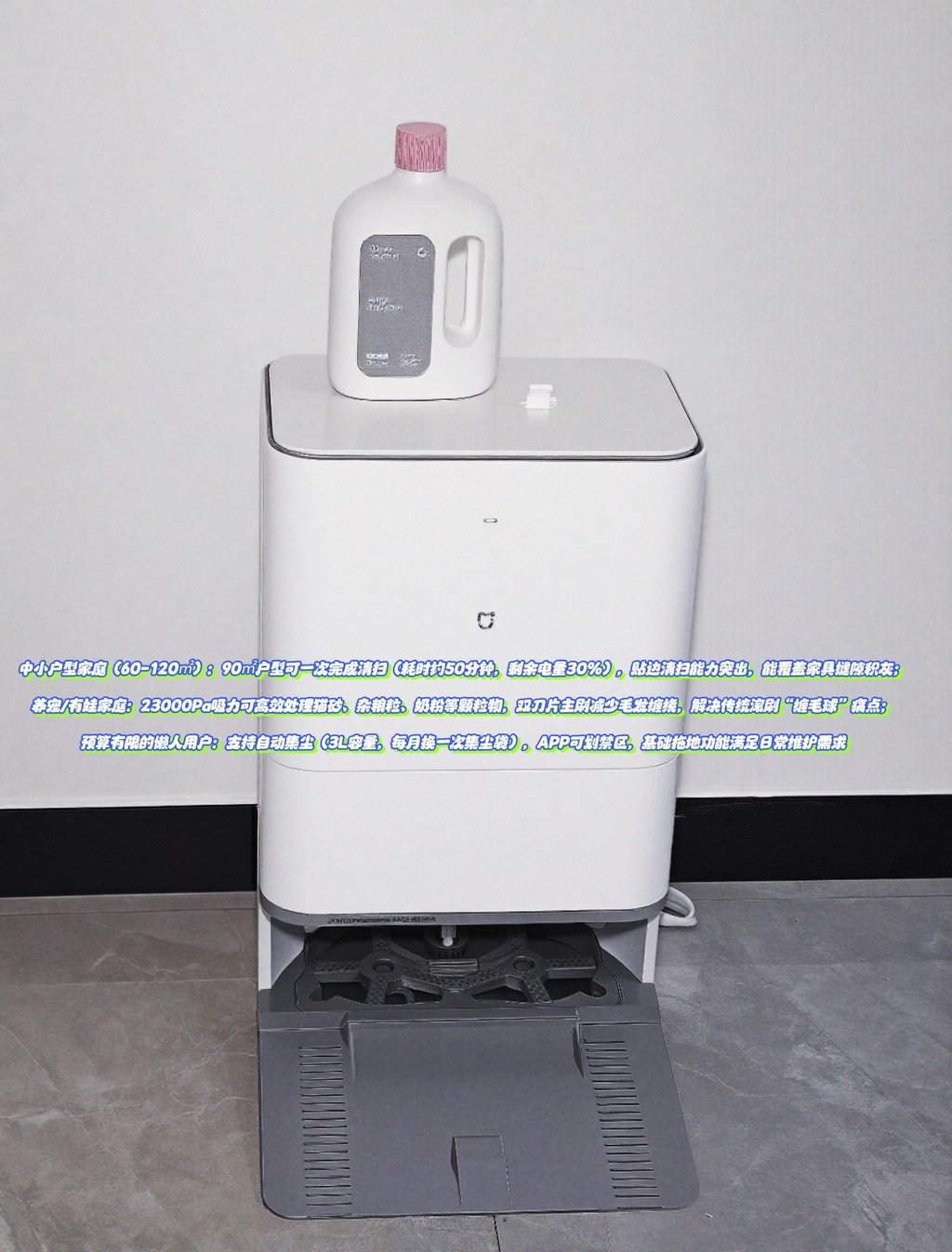 优势:吸除猫毛、饼干渣等日常垃圾高效,自集尘基站密封防扬灰,减少手动倒垃圾频率;
